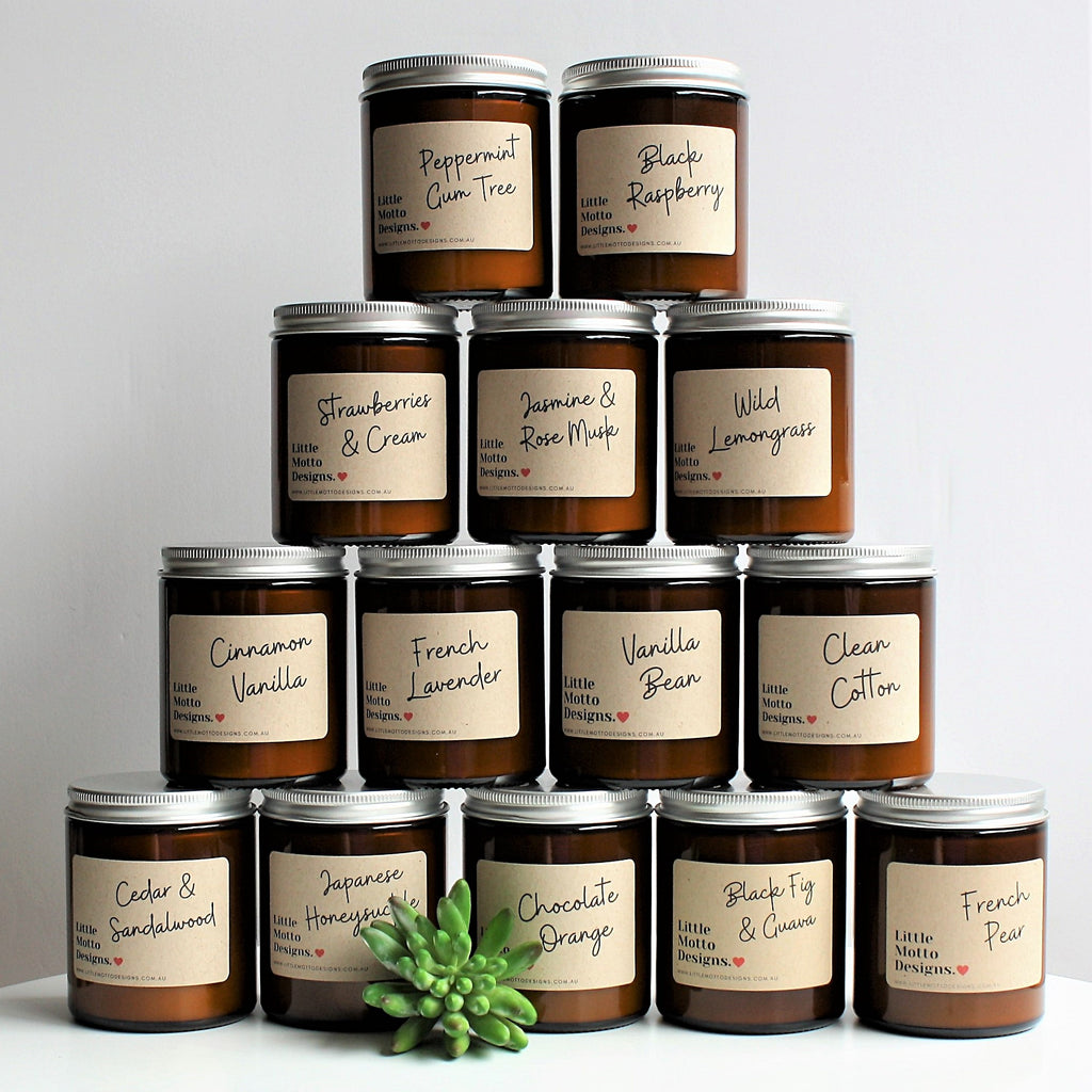We also create Custom Hampers and Corporate Gifts. All our candles are hand poured and designed in house. Please email us at info@littlemottodesigns.com.au to discuss your ideas and get a quote.