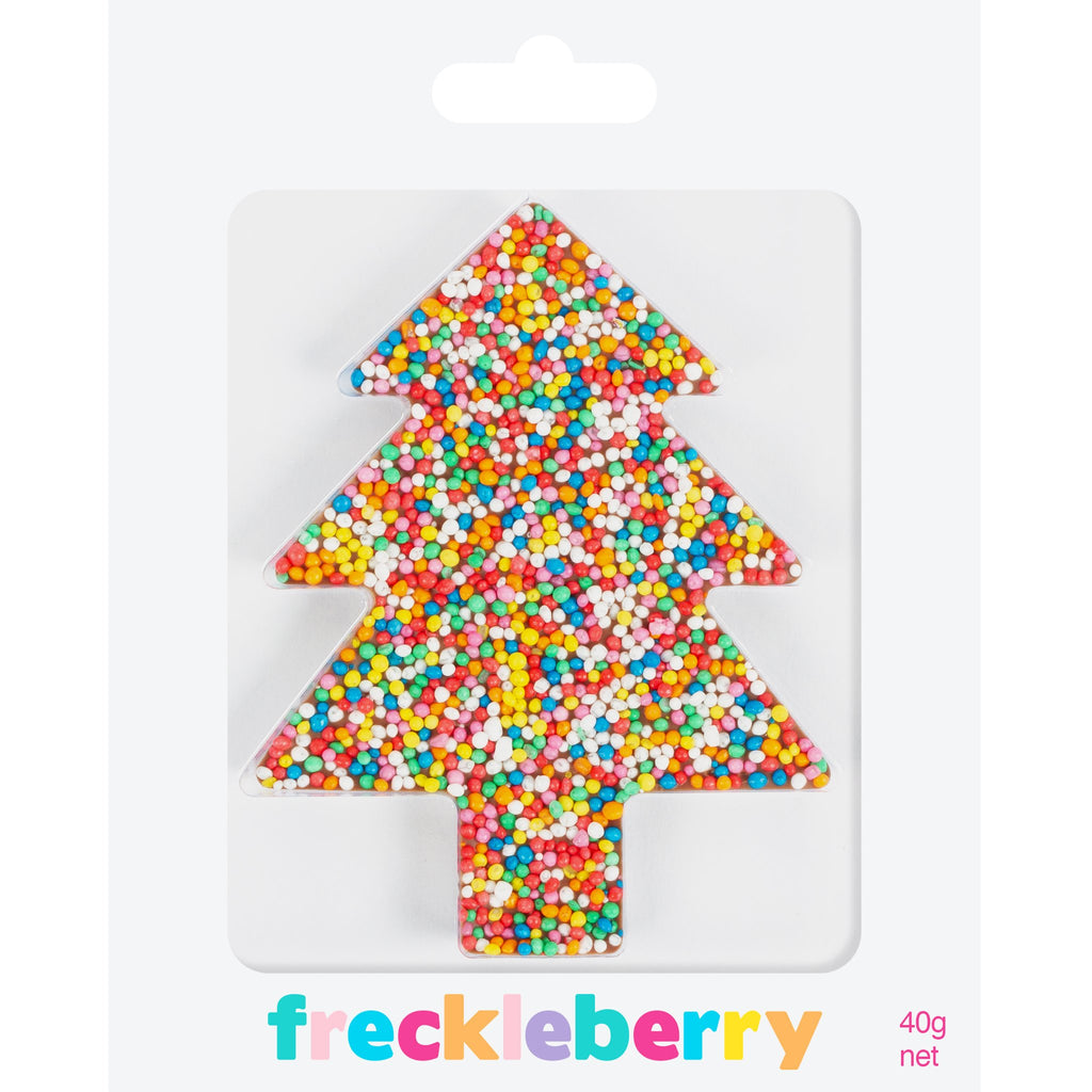 FRECKLEBERRY CHOCOLATE: Belgian milk freckle 'Christmas Tree' shaped chocolate. Approx size: 10cm x 6cm. Weight 40g.