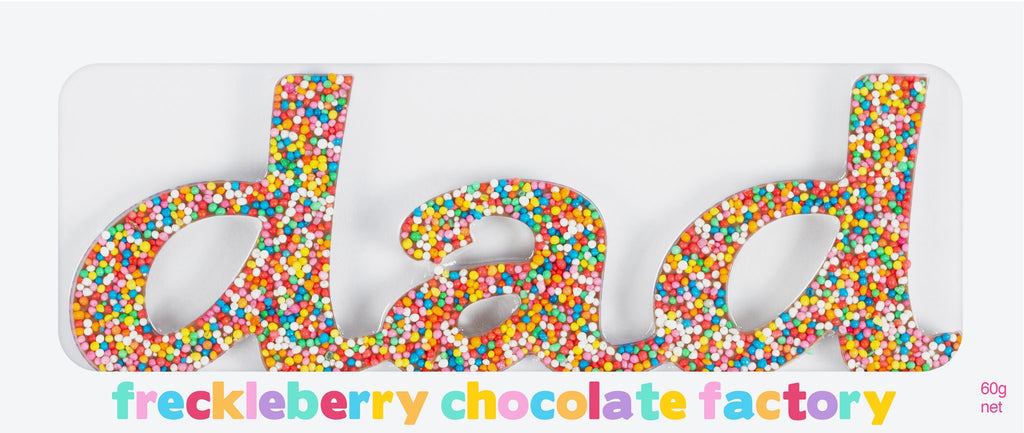 FRECKLEBERRY CHOCOLATE: Belgian milk freckle 'Dad' word chocolate. Approx size: 25cm x 11cm. Weight 60g