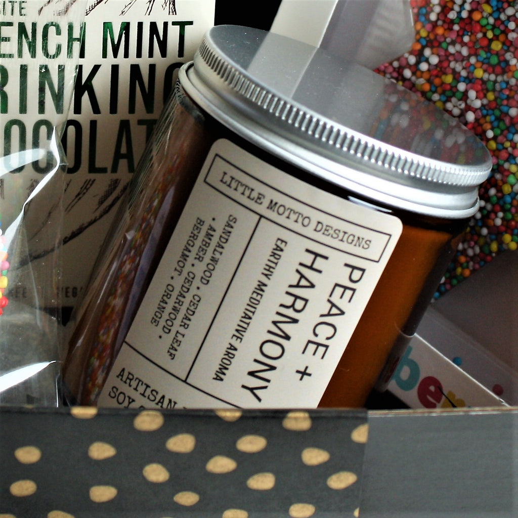 Indulgent Vanilla Bean and French Mint hot chocolate, delicious Freckleberry treats and one of our best selling unisex candles, 'Peace & Harmony'.