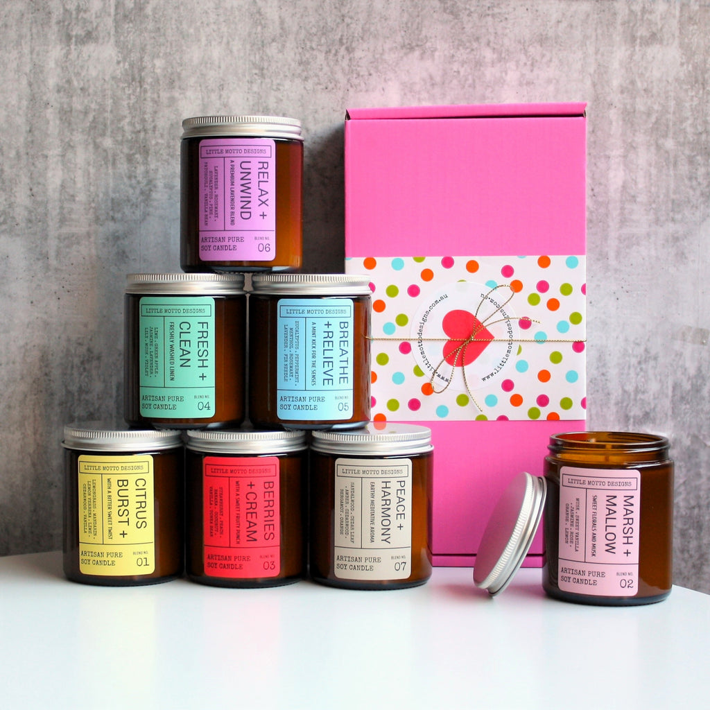 We also create Custom Hampers and Corporate Gifts. All candles are hand poured and designed by us. Please email us at info@littlemottodesigns.com.au to discuss your ideas and get a quote.
