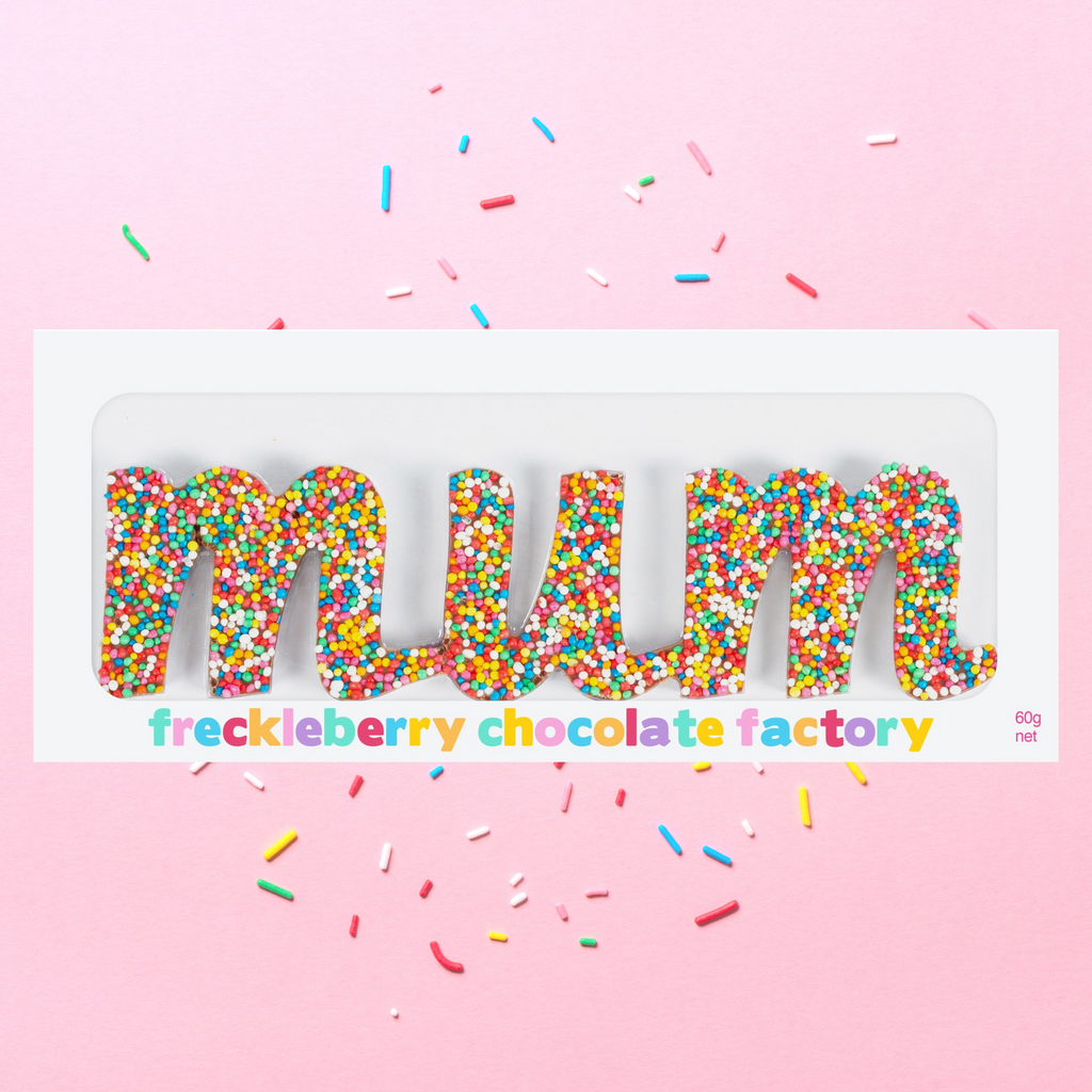 FRECKLEBERRY CHOCOLATE: Belgian milk freckle 'Mum' word chocolate. Approx size: 25cm x 11cm. Weight 60g
