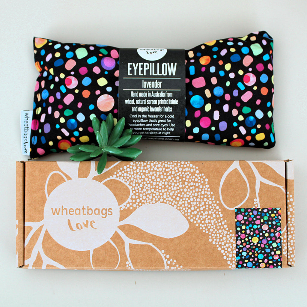 This bright and eye catching eye pillow is packed full of aromatic organic lavender and is 100% cotton. The Black Pebbles print design is part of the stunning Kasey Rainbow range, created in collaboration with the talented Brisbane artist herself.